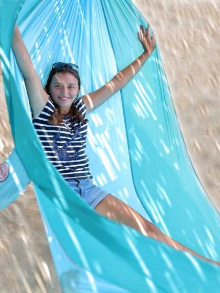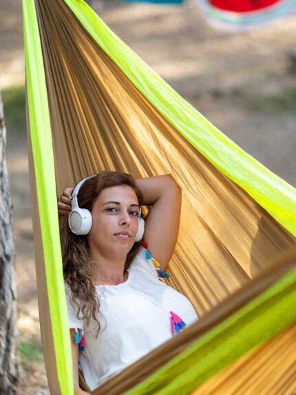 Много лек единичен хамак от парашутна коприна, който можете да вземете навсякъде с вас. Изключително лек, не заема много място в багажа ви.