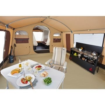 Ремаркето палатка Galleon е един от най-просторните и удобни модели. Идеален за настаняване на цялото семейство, модерният му външен вид и лесната настройка го правят изключително популярен модел. Голямата всекидневна е дълбока над 3 метра и се къпе в светлина от широките прозорци. Има налични щори на прозорците, за да се настройват нивата на светлината. Насладете се на възможноста за съхранение на допълнителен багаж с външни кутии (опция кутии с различен обем върху теглича) или външна кухня (GL версия). Двете спални осигуряват привлекателно и комфортно пространство с тъмния покрив, създавайки по-мека светлина.
