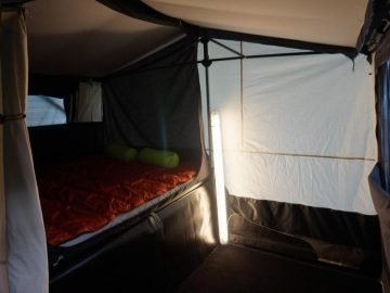 Solena разполага с удобно легло с изцяло ново покритие от вата. То е широко 1,30 метра и дълго 1,90 метра, и снабдено с решетъчна основа. Палатката е с памучна основа, която образува спалнята и може да бъде затворена с цип. Тази палатка създава слой въздух между покрива на стаята и покрива на външната палатка, който има изолиращ ефект и ограничава температурните колебания. Прозорецът на спалнята е снабден с прозрачен капак, мрежа против комари и затъмняваща щора.
